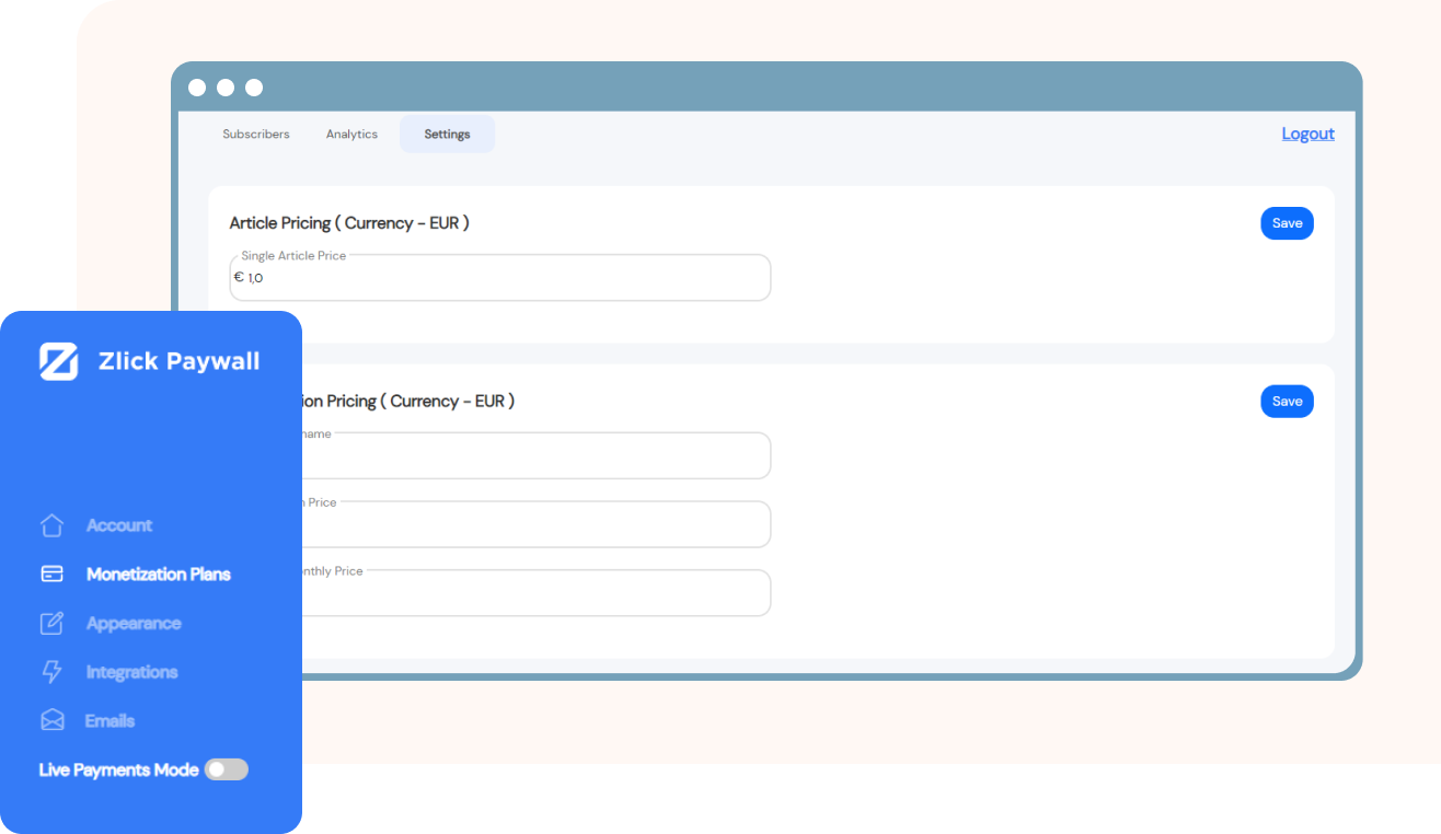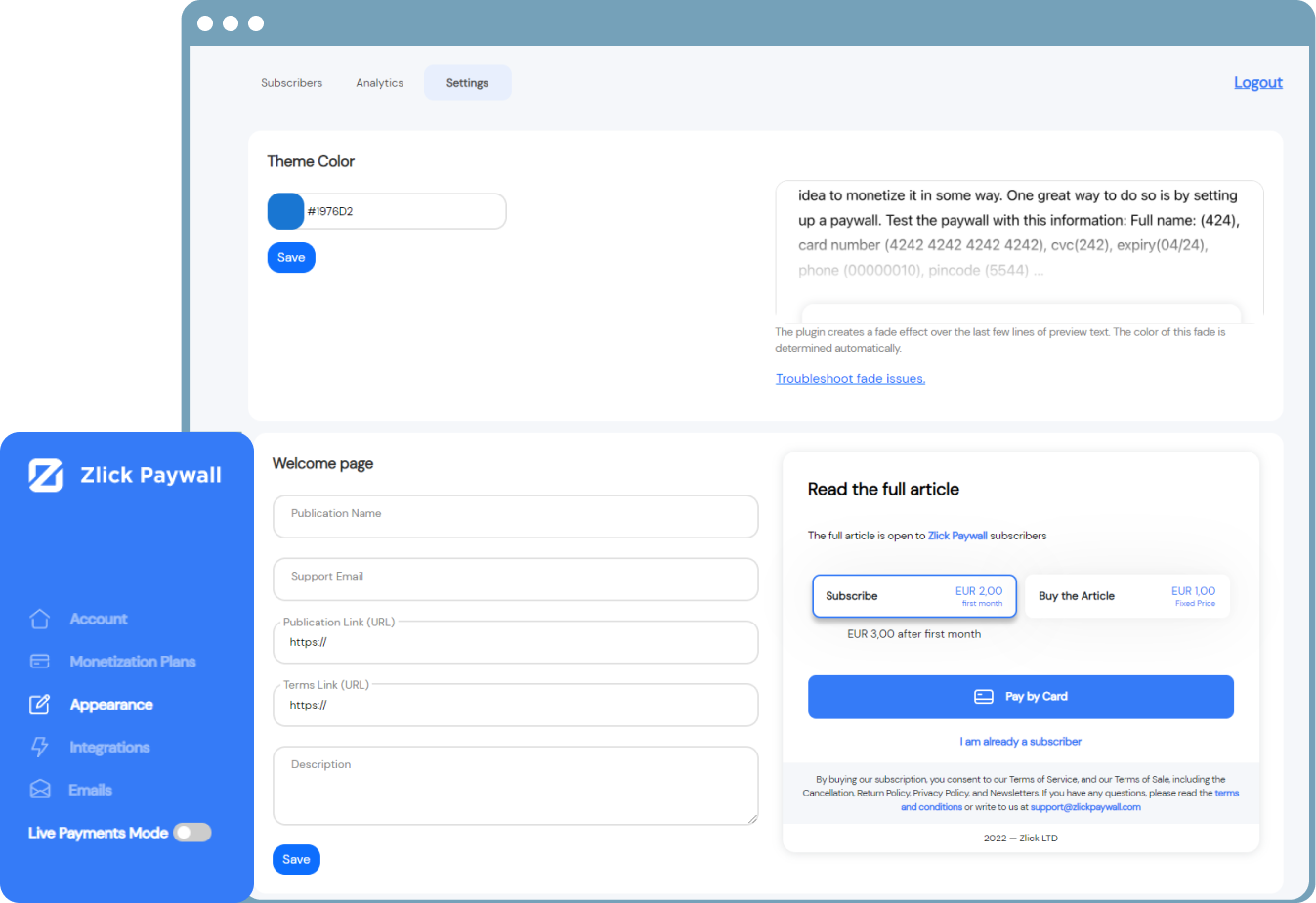 Go to Settings → Appearance in Zlick to personalize the paywall widget (the one that your customers will interact with) with your brand identity: change colors, customize texts, provide a link to your terms and conditions.